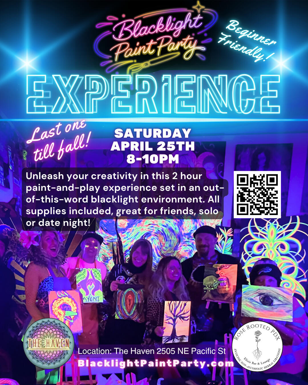 Last one of the Season!Unleash your creativity in this 2 hour paint-and-play experience set in an out-of-this-word blacklight environment.7:00pm to 9:00pm at The Haven, Portland, OR. Door open at 6:30pm