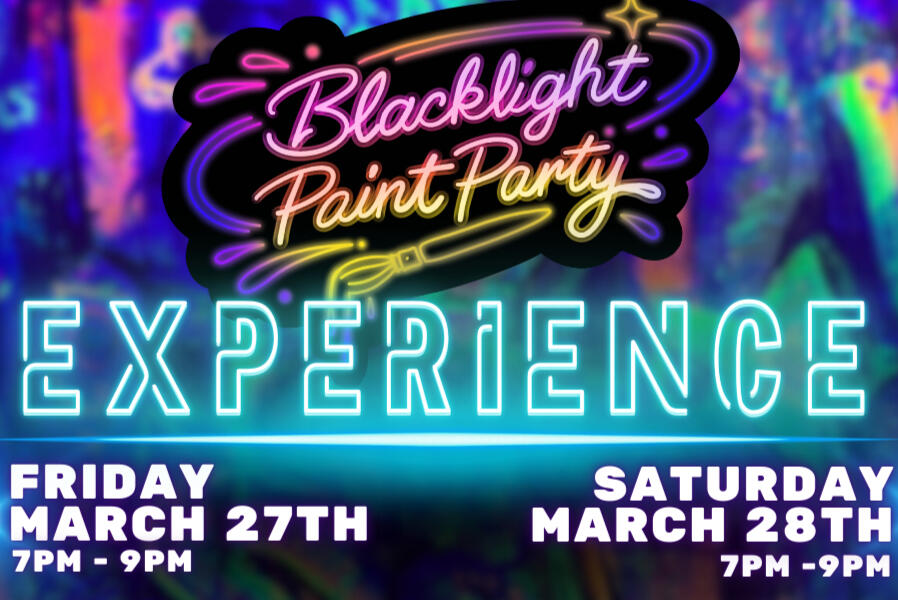 Last one of the Season!Unleash your creativity in this 2 hour paint-and-play experience set in an out-of-this-word blacklight environment.Two dates! Fri March 27th & Sat March 28th