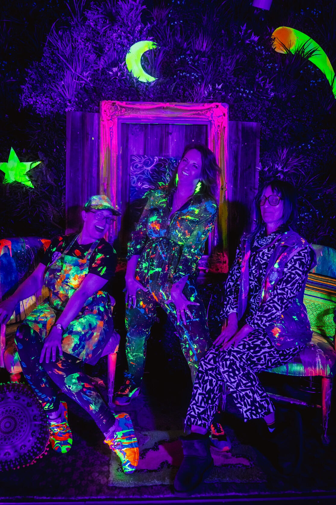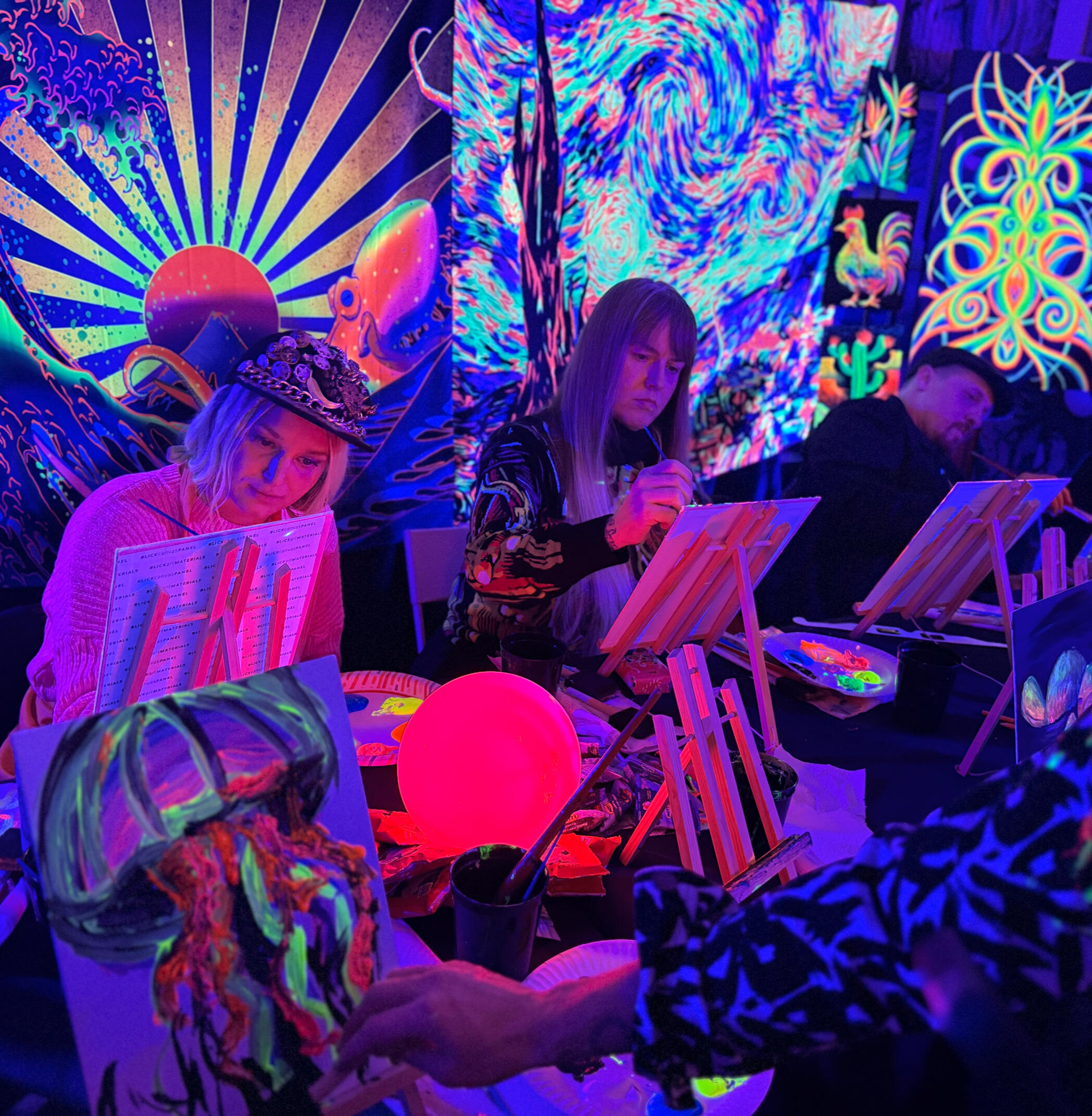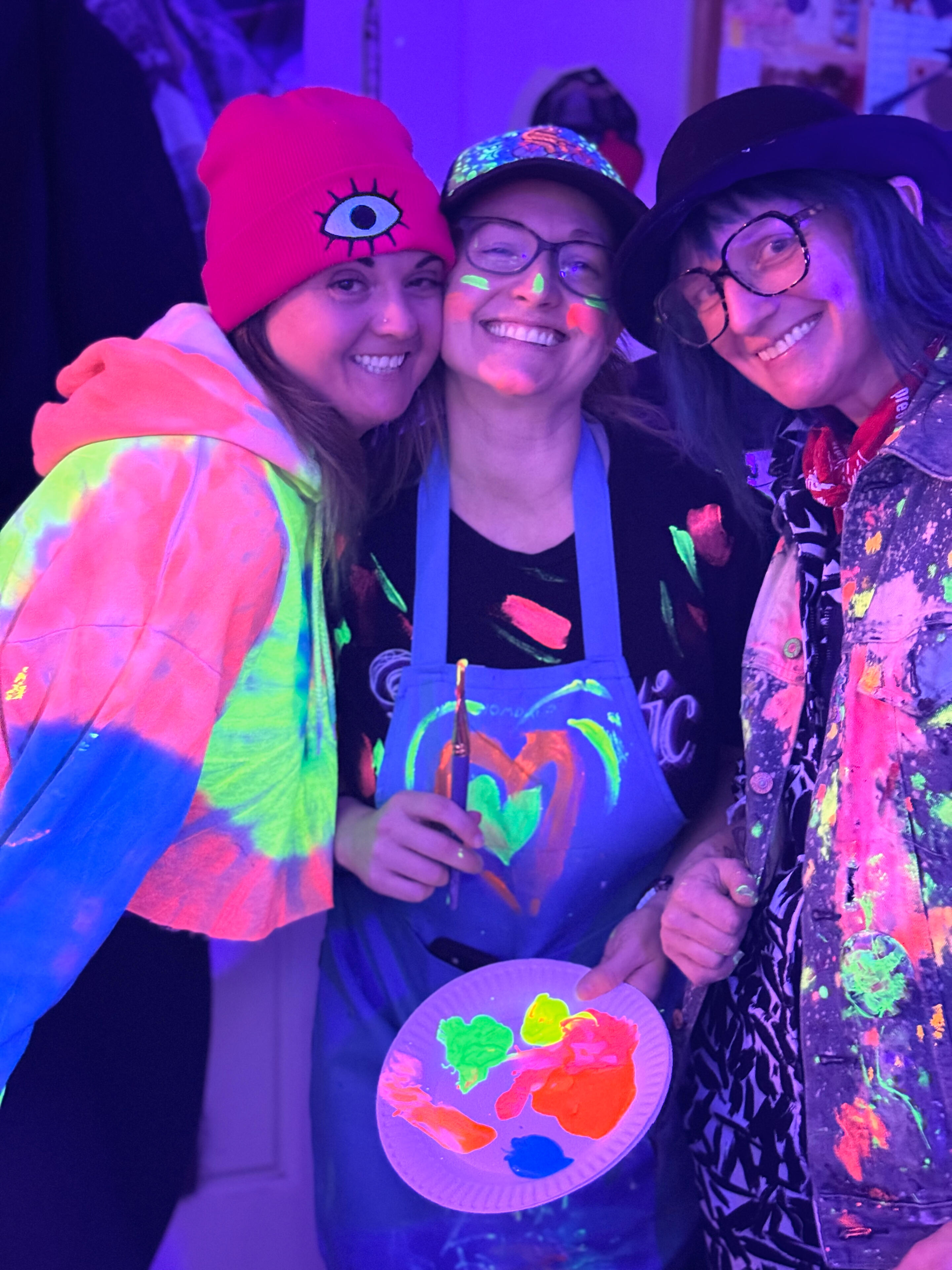 Blacklight Paint Party is not just your average painting class or workshop. It's a fully immersive, glowing, neon, fluorescent, paint-and-play experience in Portland, OR, where you can unleash your creativity in a whole new dimension!Started in 2025, founders (Artists Kindra Flavin, Chrissy Groh, and Corinne Dermond) met through local gigs, events, and shared vibes. They eventually combining their love of bright, bold art and joy in helping others find endless fun in painting to create a unique experience.They bring their fun, quirky, delightful personalities to create a non-judgmental, let-your-hair-down, playful environment for others to let their inner artist go to town!